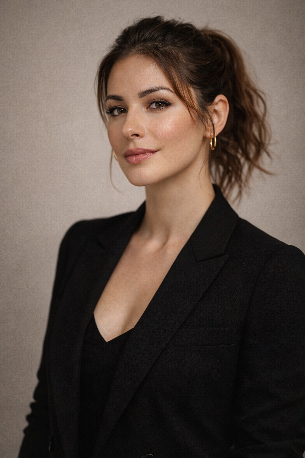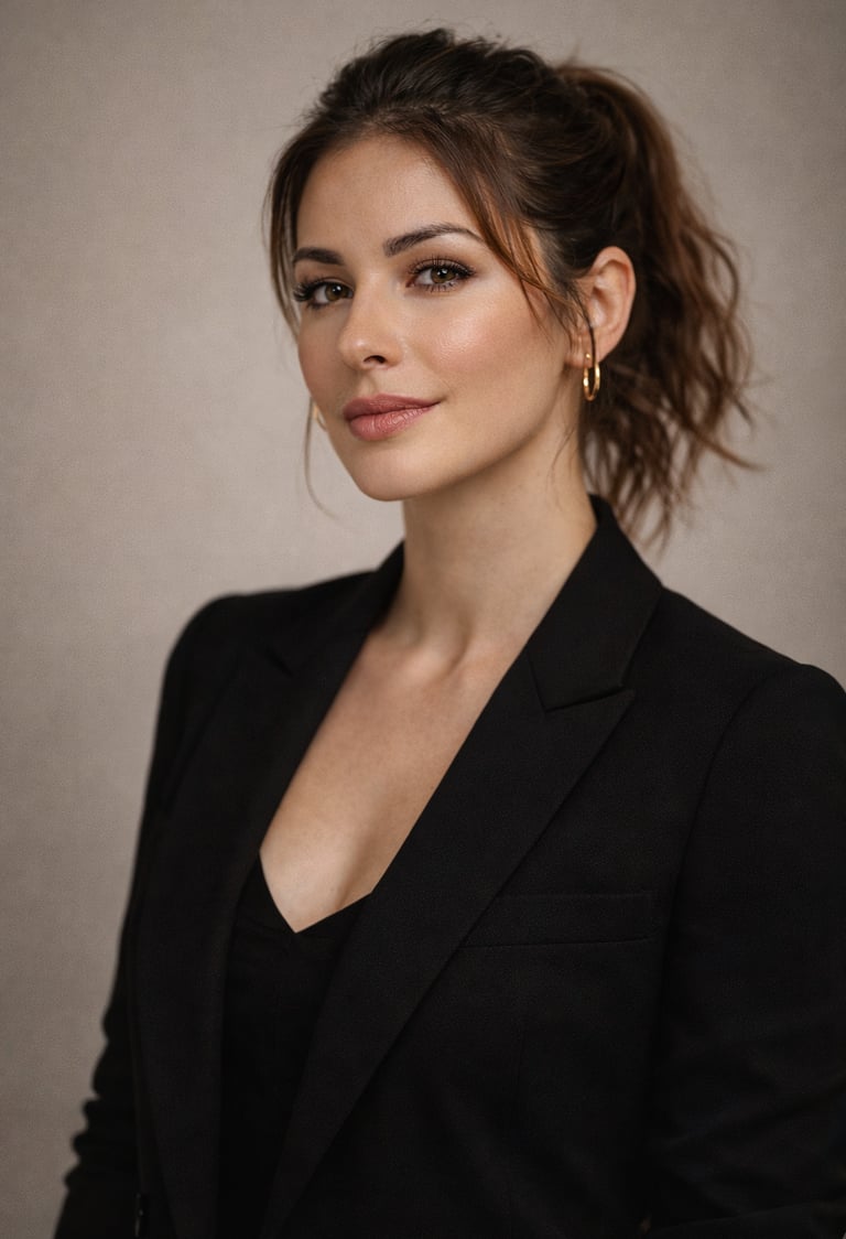 Editorial portrait of a confident woman, studio lighting, neutral background, fashion photography, great detail