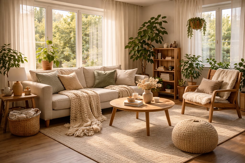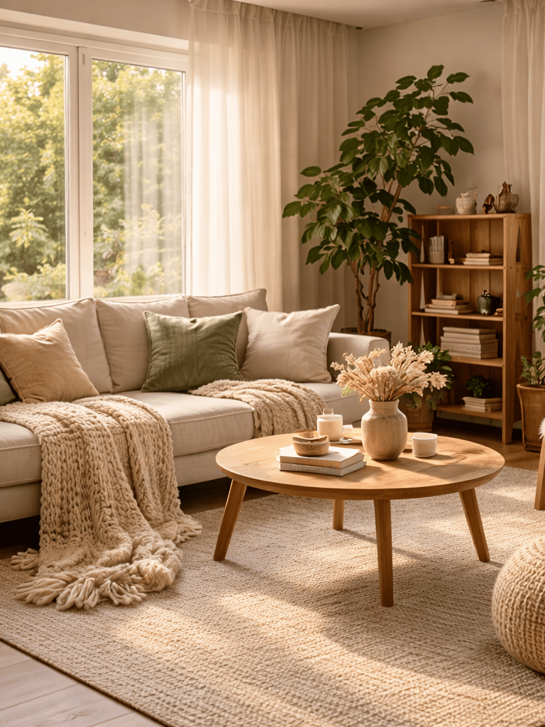 soft blankets, plants, wooden furniture, Scandinavian interior design,