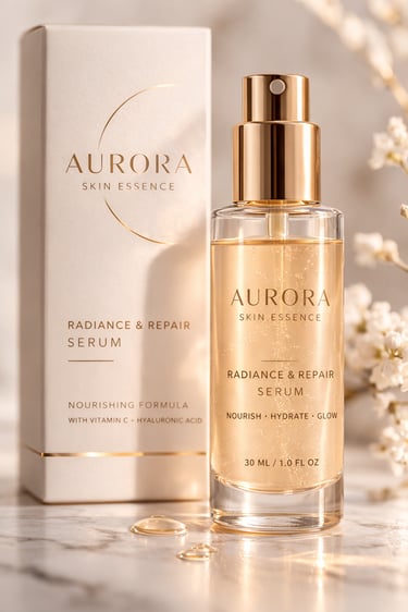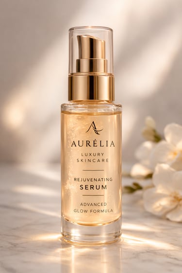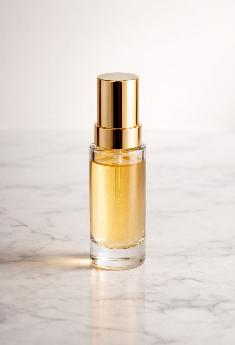 Luxury skincare serum bottle on white marble surface, soft studio lighting, minimal background, commercial product photography, ultra realistic