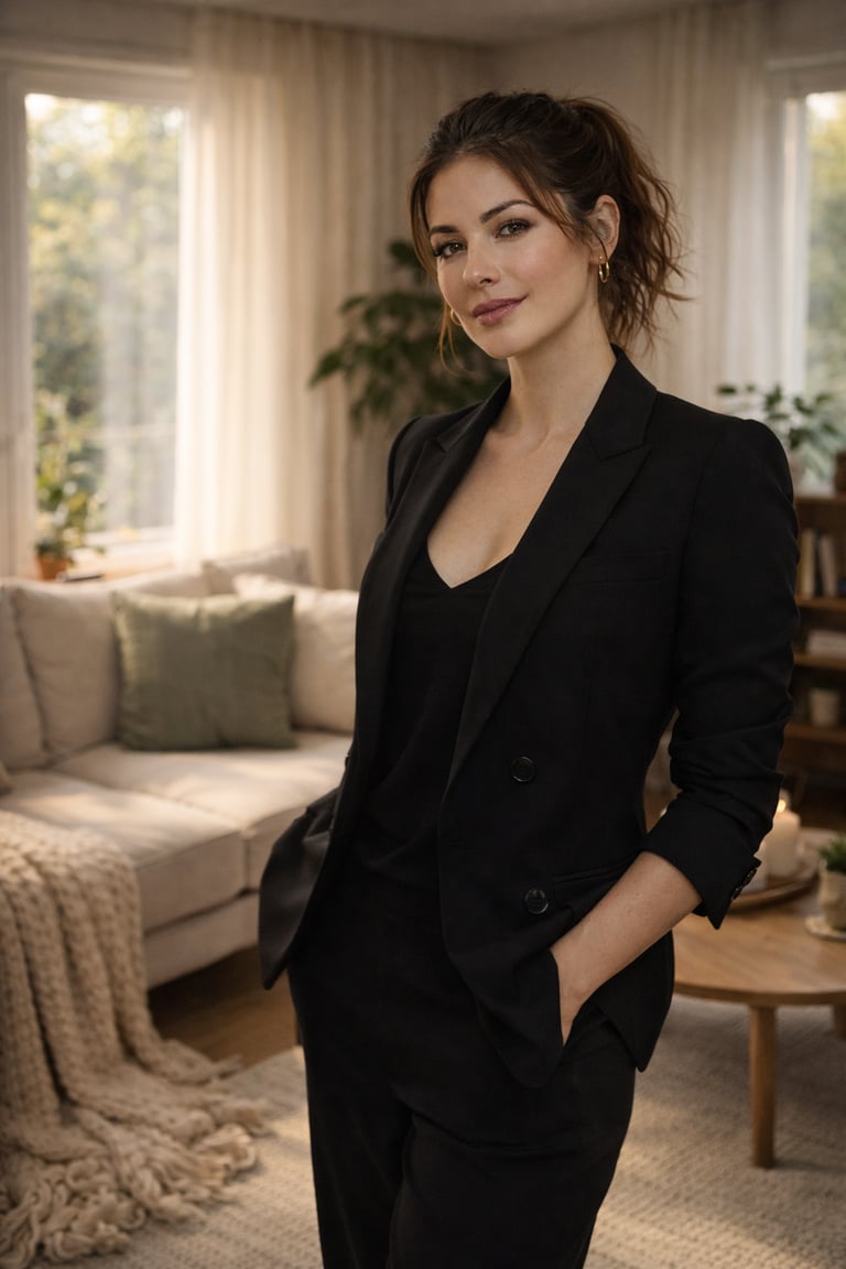 Prompt 1:: Editorial portrait of a confident woman standing in a cozy Scandinavian living room, warm sunlight through large windows, minimal wooden furniture, plants and soft blankets, fashion photography style, neutral background tones, cinematic lighting, photorealistic, great detail