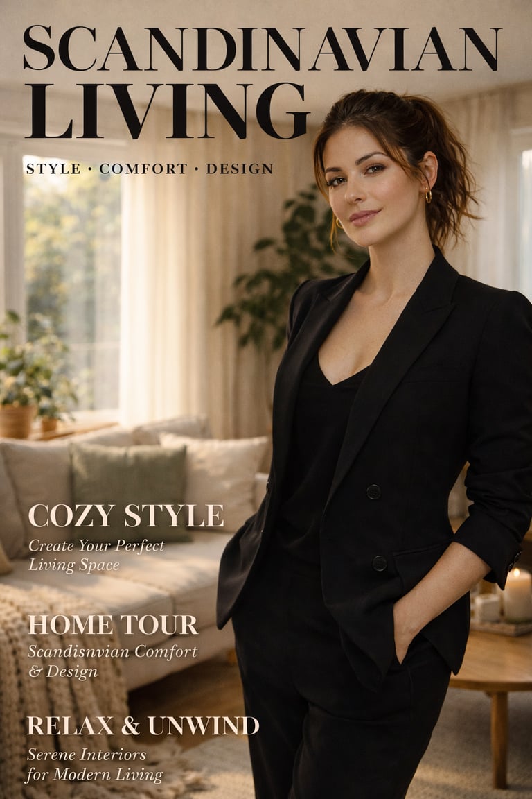 Prompt 3: Magazine cover featuring a confident woman in a cozy Scandinavian living room, warm sunlight through large windows, plants, wooden furniture, soft blankets, interior design editorial photography, minimal elegant typography layout, photorealistic, high detail